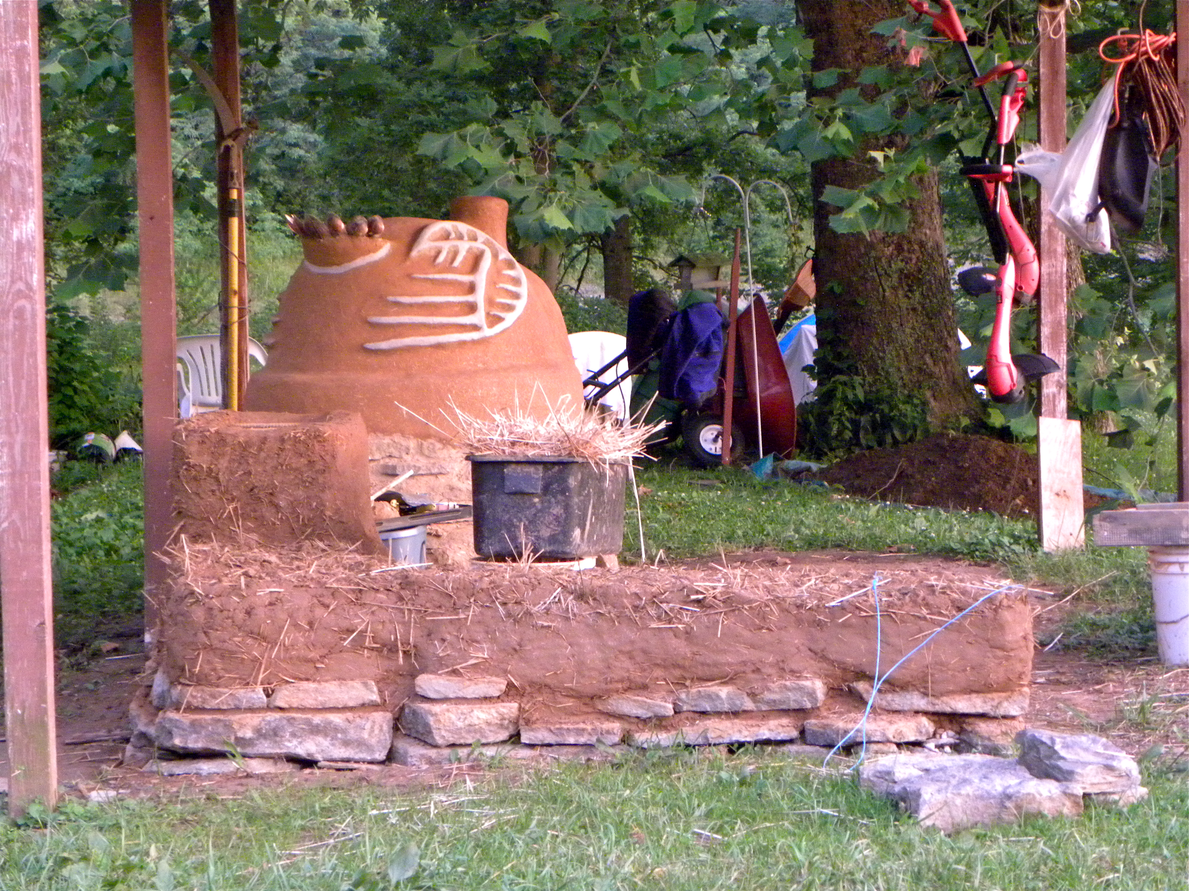 During the summer drought of 2012, with its unrelenting temperatures above 100° F (+40° C), myself –Doug Crouch– and fellow branch of the TreeYo, Eva Wimmer, built a Cob Oven as the cornerstone of the outdoor social/cooking space at Confluence Forest and Farm in Northern Kentucky, USA. The project last year took us about two weeks. We worked on and off with full days being rare because of the oppressive heat as we camped on one of the perched ridgetops above the lake. This year we have also been working for about two weeks on the next phase of implementation amongst other tasks.