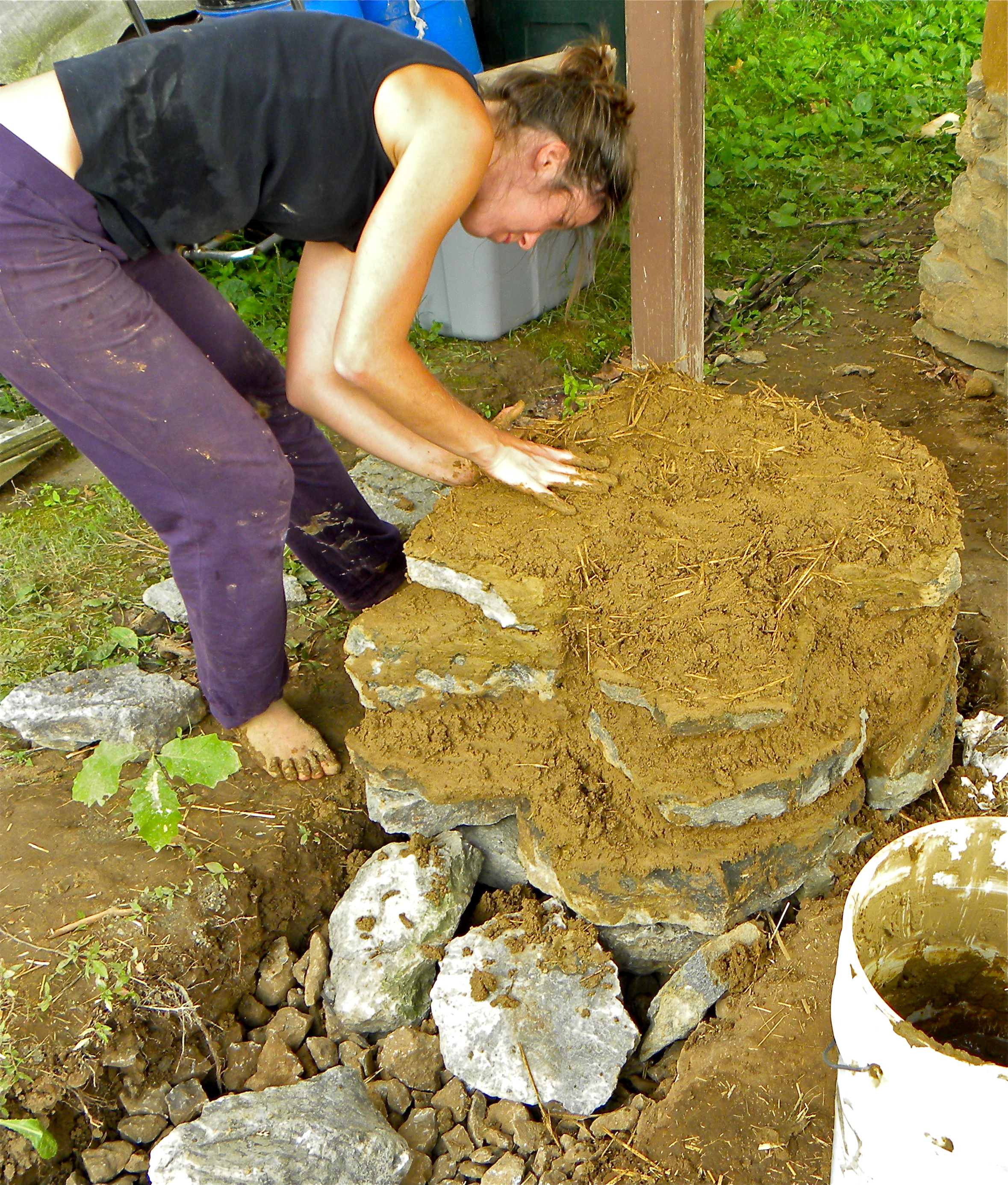 With this great crew of people we did the same process of collecting, digging, stomping, and building. With so many people there, we quickly decided to go bigger with the bench. Simply put, our original plans were to small for the energetic crowd and great weather for this inspiring community action. Consequently, Eva got to teach a lot about cob and