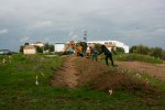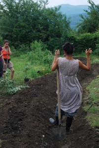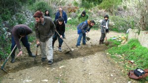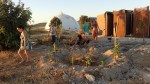 Doug leading students in digging a trench for water harvesting into a tank on Terra Mae, a host for Field Trips