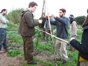 Students learning to use an A-Frame which is a low tech way of finding level for swale building and water harvesting