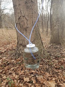 This is my third year with it here at the lake in terms of full time suggarin, not just helping like years before. I have more of the right equipment and supplies in place so on day 1, 50 taps going in was quite easy. Glass jars, plastic lids, plastic tubing, and plastic 5-gallon jugs to transport the sap is our outdoor setup. I like glass what can I say. I try and avoid the sap water sitting in plastic for too long, so I have my system/equipment of choice.