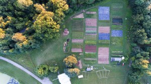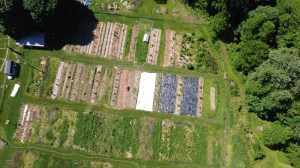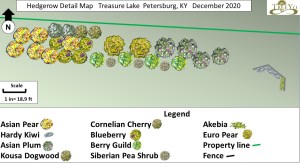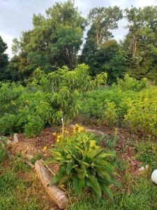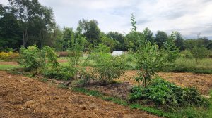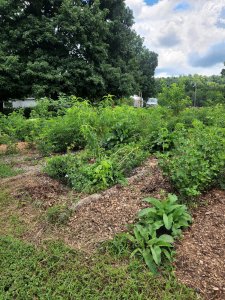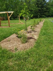 In 2022, Quadrant 1 tree rows were managed with intensive mulching and also planting in many guild plants. This added a layer of beauty and weed suppressing functionality and of course the pollinators loved it. It really helps to fill out the layers of the food forests with fruit trees as canopy, elderberry shrub, currant bush layer, comfrey and flowers like grey headed coneflower and strawberry running underneath. Again, the focus of this is not so much production of fruit, which is a byproduct, but more about plant material for propagation. It was also about further developing a pattern for the edible landscaping work. For example, at the Gordon Homestead in Central Indiana, we created essentially the same pattern. Tree rows with mixed layers of plants with alleys in between of about 25 ft.