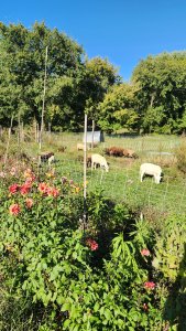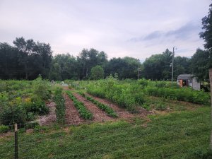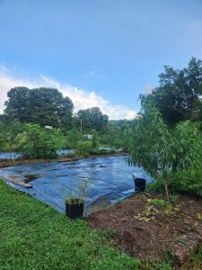 Besides nursery stock in the alleys and agroforestry lines, there was another set of implementation and management occurring. Not all of this is just about plants as we have integrated sheep in quadrant 4 and the back hedgerow to help maintain and fertilize. We also raised meat birds and while they were supposed to remain in quad 1 and 2 it got way too hot early in the summer and we moved them to the back hedgerow/ trellis vine area. That old backstop of my grandfather’s now holds 3 hardy kiwi vines and 2 Akebia that were well fertilized by the chickens. We grew about 55 meat birds this year thinking to eat one each week. After the meat birds were done we raised ducklings and layer chicks together in the garden until the layer chicks became pullets and could handle being with the adult chickens across the way. The ducks are currently in quadrant 3 producing duck eggs on the daily!