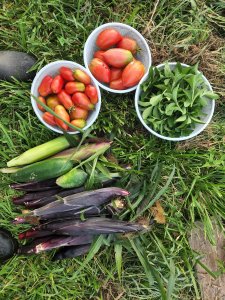 Also, in quite a few cells we planted vegetables, herbs, flowers, and also perennials. We ended up producing quite a bit as I really like focusing on staples like root vegetables such as sweet potato or turnip, paste tomatoes (still tons in the freezer), squash, watermelon, and corn. Some vegetables were also planted in the agroforestry rows that hadn’t been filled up with tons of perennials like the okra in the cherry bed that was missing two sweet cherries that will arrive spring 2023. With all these trees and shrubs planted for sure we harvested fruit this year. I mainly pick the fruit off when the trees are young but one or two stay on just to peak the curiosity of the passerby. And with stacking in space and time the food forest way, yields from plants like elderberry and aronia happened as they were quite mature plants when put in the ground. Finally on the edge just outside the garden we housed goat rotations several times last year. It brings the goat manure bedding even closer and combines trips so to speak. Both the tomatoes and goat meat will be staples in our upcoming Winter Weekend PDC.