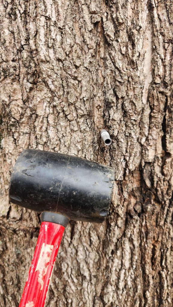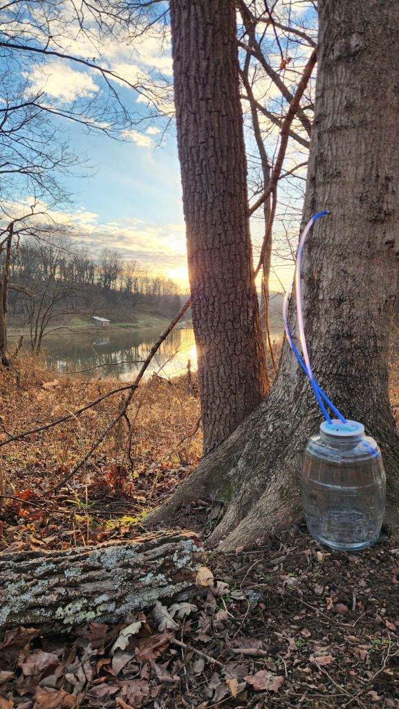 Sweet ’26 Sugarin season has begun as maple trees have been tapped this week with a few to go. A critical part of our silvopasture, homestead food supply, and cottage industry. Lots of washing and packing of materials and tools, drill and fit spile in tree. Then tap-tap-tapperoo away till it thunks and the spout is set. Place glass, put lid on, measure tub, fix it to spile and jug, and wait. Boil downs will probably start tomorrow. Soon delicious and nutritious nonfiltered small batch organic local sugar, maple syrup. Thank you, Dionysus, for this new year and new harvest season.