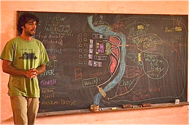 During the course we incorporate a series of interactive exercises called ‘design games’ to review and reinforce the material that is being learned. These consist of various mock landscapes on paper, the board, or scaled down 3D landscapes, which offer the students the opportunity to design in diverse environments. Students learn different elements found on a permaculture property and how and why they interrelate in reflection of the permaculture principles. We utilize our own set of design element card pack making the PDC even more unique in that way. Furthermore, whether it’s a chemical plant upstream or marauding pirates on an island, design games also bring in a bit of fun in the way of challenges to lighten up the atmosphere of the class. The mock designs are worked on in groups to simulate the final design project thus making that process easier through this experiential learning beforehand. They are reviewed by the entire class, with an emphasis on making connections between elements on the site so as to allow students to see how theory is applied as a designer. We also do theatre classes to help people with kinesthetic learning beyond just hands-on. Furthermore we break into small groups often to also do group discussions. This allows everyones voice to be heard and are often spontaneous when the energy inside the classroom needs shifted. However some are pre planned and incorporate the whole group like our sharing on patterns in nature which is an explorative and reflective activity after the slideshow. It helps us to pause which most of these exercises to do that way we have the time and space to integrate the lessons. All of this is to bring a diversity of teaching modalities into the learning atmosphere and increase group dynamics. In other words, we apply the permaculture principles to the course itself with for the important function of learning we use multiple elements.