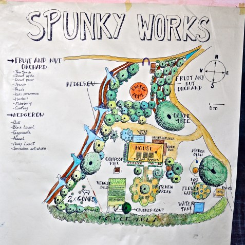 The general pattern is that in the first week of the course students are split into design groups, each group focusing on a different site, while fulfilling similar needs of their respective “client”. Students work in groups to further develop community building skills, including decision-making and facilitation. This practice empowers students as they take control of their own learning process, both as individuals and as a community of emerging permaculturists. To accomplish this design project, students are given design time during the course and often they work during breaks and the evening session as the buzz around it builds. It is an intense process but students really obtain a lot from this experience. It culminates with each group delivering a roughly 35 minute presentation based on their overall group design as well as an individual detail. Individual details are zoom-ins on a particular patch and allow the students to focus on one particular facet held within the overall design such as a house design or integrated swale and food forest area.
