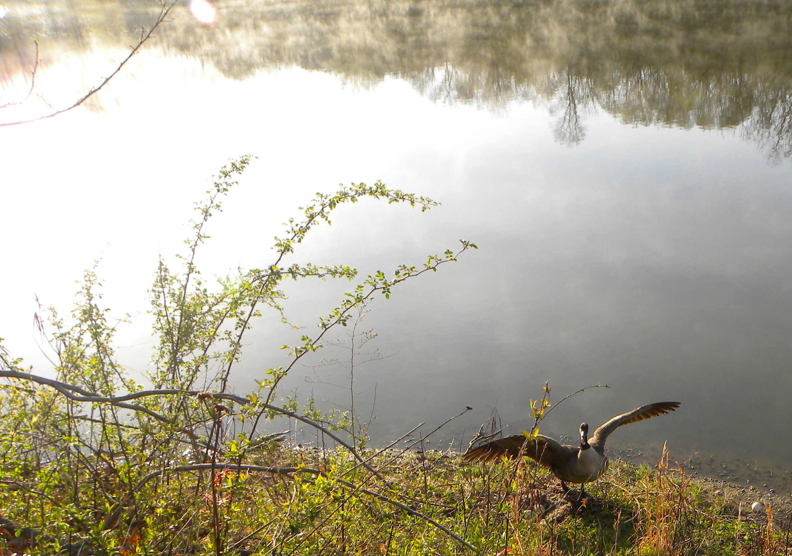 goose coming off its nest at age of lake