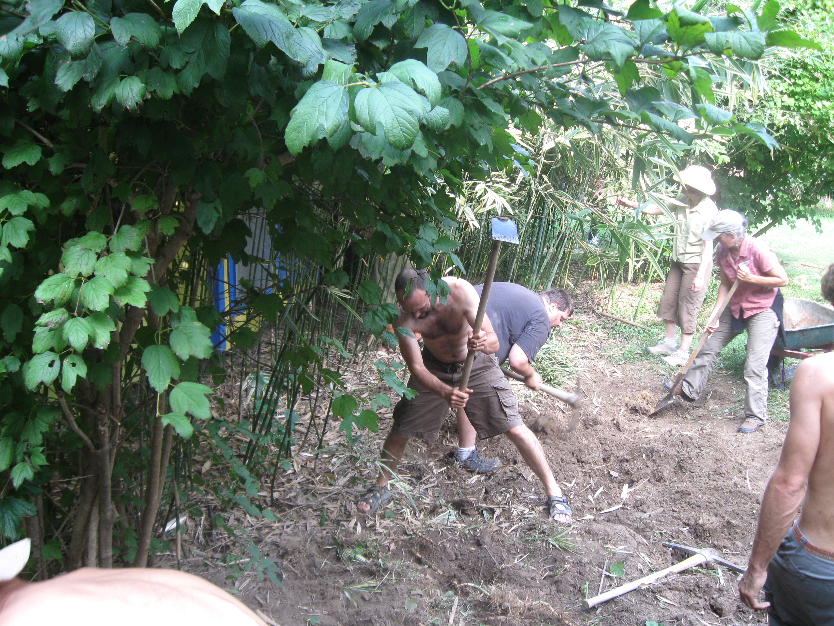 We were working with a water problem next to the Ecovillage Training Center Building and hostel at The Farm. We were dealing with clogged pipes, dense vegetation and a slope bringing the water back towards the hostel. Brad then led us in a rain garden hands on so that we could learn a basic technique for the hydrating of landscapes. I always go back to the following Bill Mollison’s quote when I think about Rain gardens, “Though the problems of the world become increasingly complex, the solutions remain embarrassingly simple”. This is so true for Rain Gardens, its a hole in the ground where water is directed that helps to vastly improve the water quality of a region. Flooding and non point source pollution have been shown to be drastically reduced in a study by the Environmental Protection Agency in my hometown of Cincinnati. Again not rocket science but just a pattern in nature, the wallow of the pig or bison.
