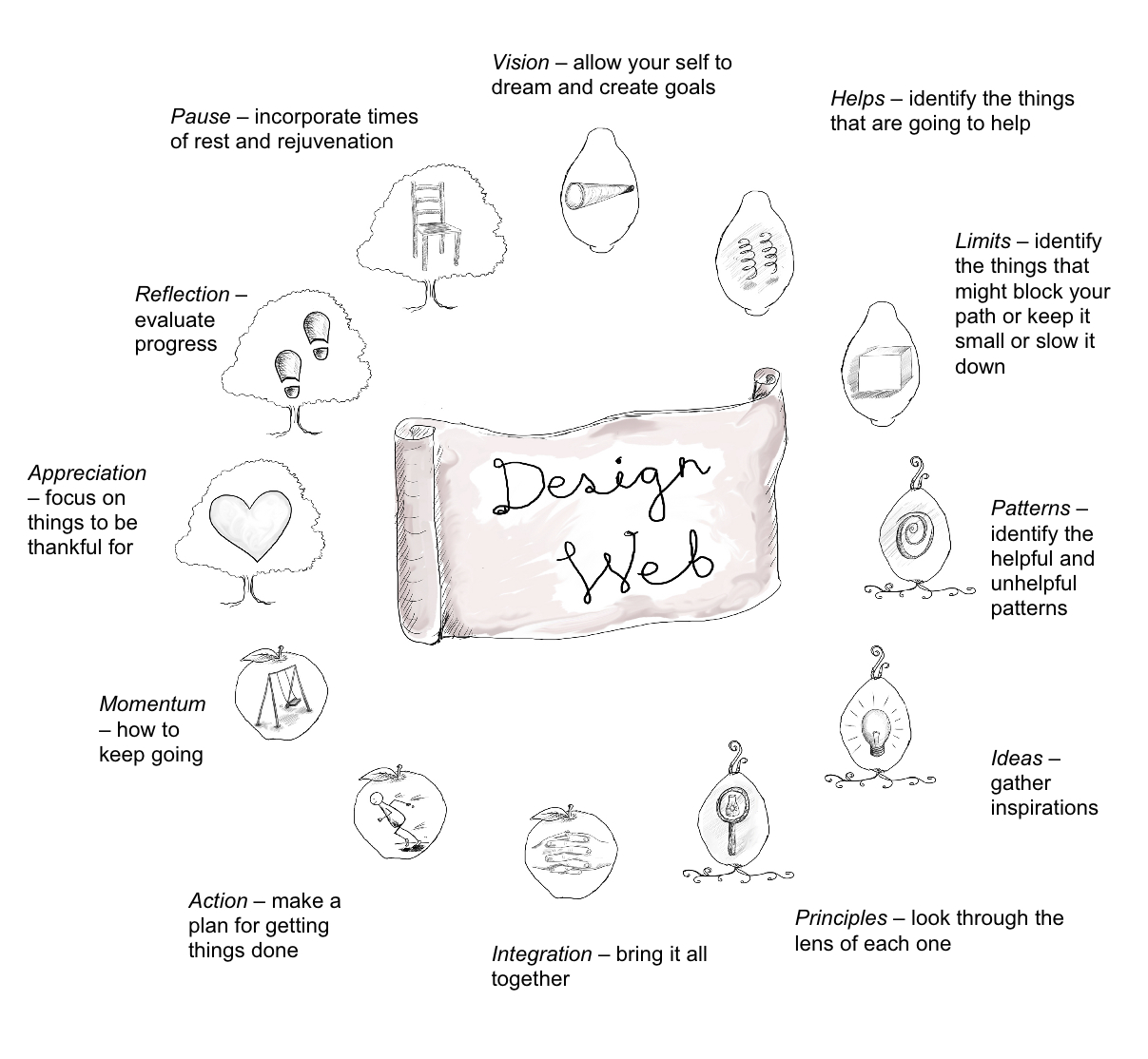 “Through creating a web of design, I have a more holistic perspective of the project. New ideas have been inspired and core/ soul connection has been formed. Through the web, a deeper understanding of the social dynamic has occurred and is a balancing force now. Action is teetered, while inspiration for momentum is sought. Patterns need broken, principles reflected, and appreciation conjured. “