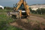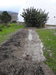 Before we got there we did our first hands-on in by creating a small earthwork to deal with concentrated runoff. After observing the catchment around the dome and all of its impervious surfaces, placing flags where electricity and water infrastructure were below the ground, and then laying a contour line below the gutter shedding water from the impervious landscape, we simply began to dig. It was a quick burst of energy to get this nine meter swale in as the light of the day was fading in this late fall season. We combined that with a silt trap, sort of pocket pond, to help increase the infiltration capacity and work around an existing mature Carob tree. We did the back cut, pulled the earth downhill for the mound, sculpted the mound for a planting space and level, and put in the spillway with rocks in our planned overflow route. To finish we sowed a cover crop and lightly mulched to get the healing process started from moving the earth. This swale is the exact kind that I think warrants its addition in the landscape, a very small one, in a sort of zone two placement within this zone 0 of the dome space. In my opinion, they are not broad acre additions usually, rather this exact context, a catchment area from impervious surfaces artificially discharging a concentrated flow that is erosive over time and needs a landscape intervention. Put the berm and basin in, and slow, spread, and sink the water.