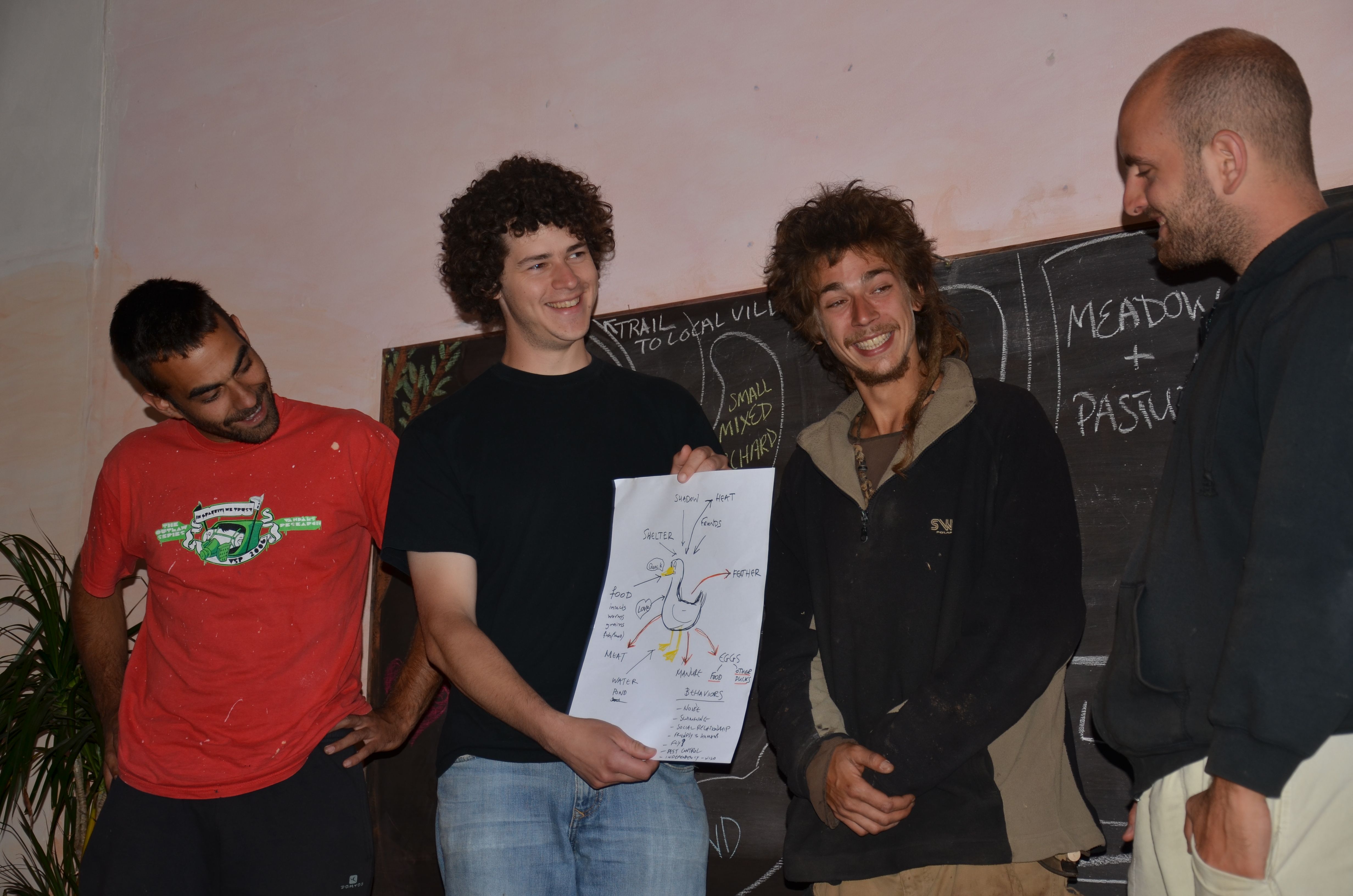 These exercises allow students to explore topics and learn to drive their own education as well as build on and reinforce information from previous presentations rather than just straight lecture. This format really makes the class more engaging and develops a deeper understanding for students. As you can see here in the above photo, students are really enjoying the atmosphere of talking about ducks and generating ideas around the endless opportunities to integrate them into a Permaculture system.