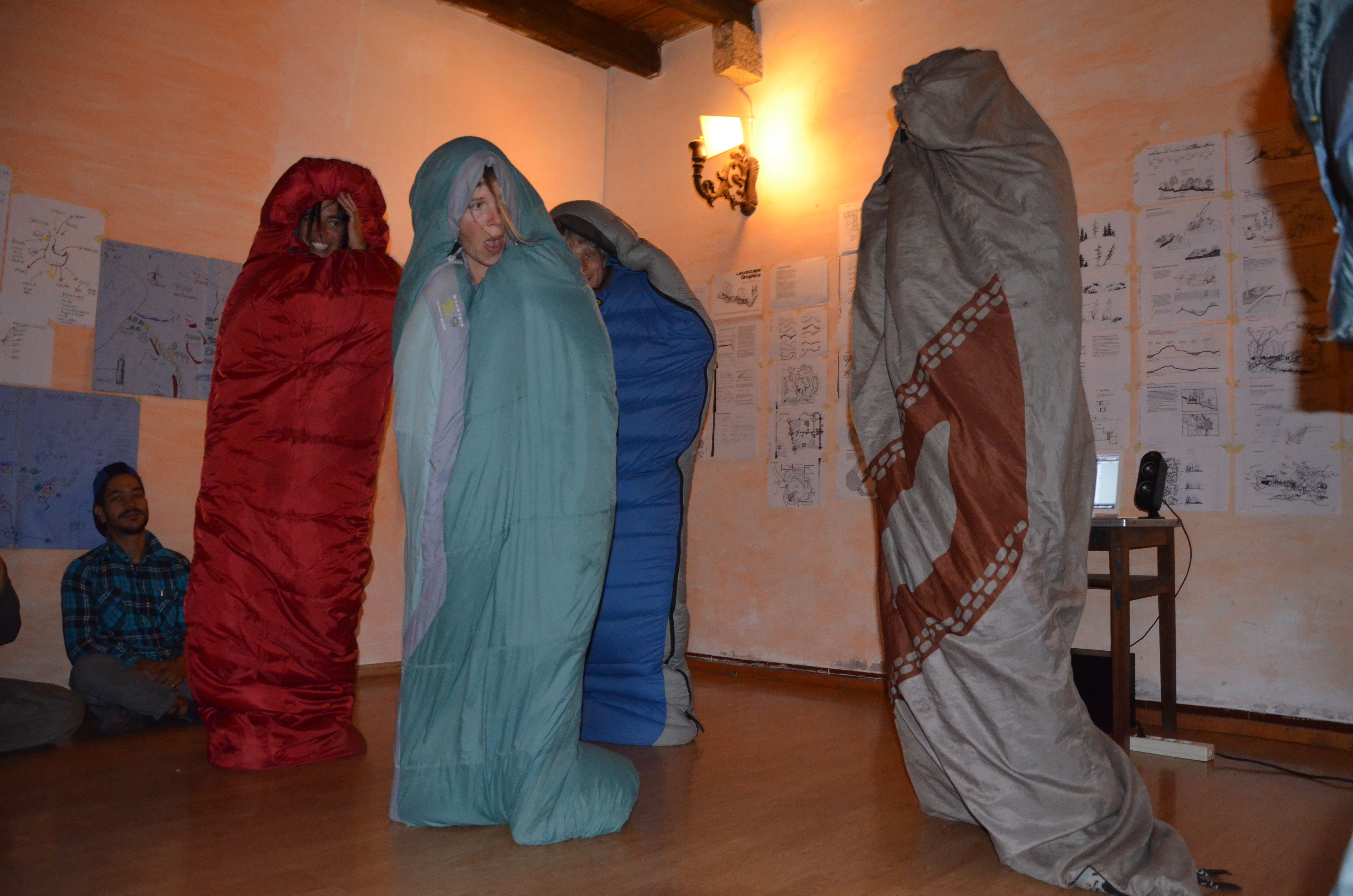 After successfully completing the intensive design process by presenting the final projects, we all performed and shared in the “No-Talent” show. While apprehensive at first, the students settled into the silliness and reflective process of this piece of the pedagogy of Uncle Bill. One of the highlights of the show was Ronan “tricking out” his van, permaculture style, on the white board with keyline dams in the sink of the van’s small kitchenette and greenhouses on the sunny dash. As the evening softened the last of the daylight, we moved inside to take in several more creative performances and games of all sorts. One such performance was the “Wiggle Worms” sleeping bag dance party. Thanks for all the fun and laughter!