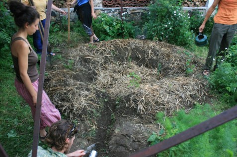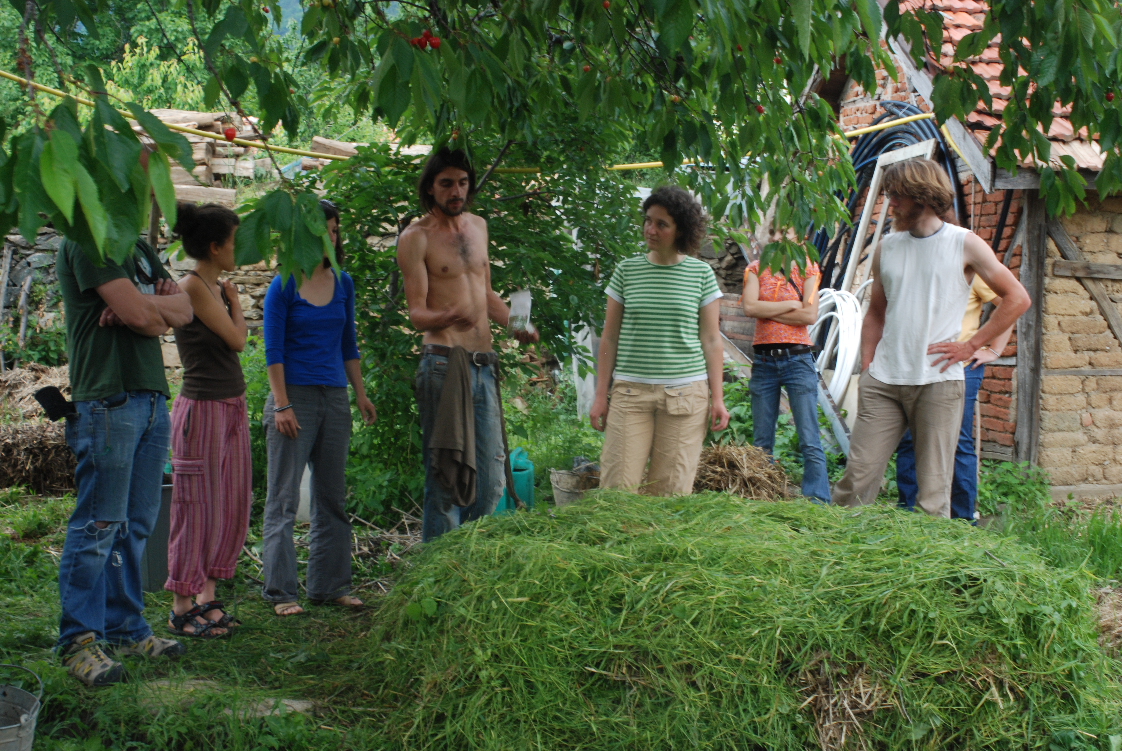 The workshop was a great success for Permaculture in Bulgaria as there was nearly 40 people who participated at different stages throughout the workshop. Not only did the students learn a lot in the classroom, we got out and started to deal wit the water and fertility of the site hands-on. Swales, rain gardens, greywater involved spreading and sinking water throughout the site through very simple berm and basin technology. We also squeezed in habitat creation with hedgerow plantings and trye pond construction. With the soils clearly lacking the beneficial fungi, we built a micro-organism factory, better known as a hot, aerobic compost pile.