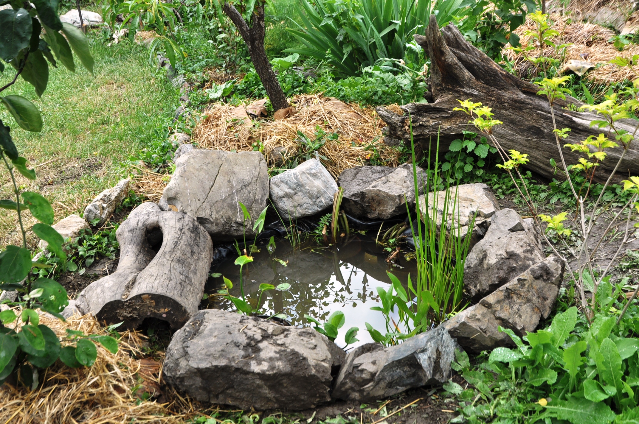 The pond was created by using an old tractor tyre and a plastic lining that is used in living-roof construction. We found a great nursery in Bulgaria that had many edible aquatic plants and we collected others from wetlands to complete the designs. It’s a great addition to the garden for biodiversity and food production. These small additions can also help in pest control, biomass production, and microclimate creation. All the while they are extremely aesthetically pleasing when arranged and orientated appropriately.