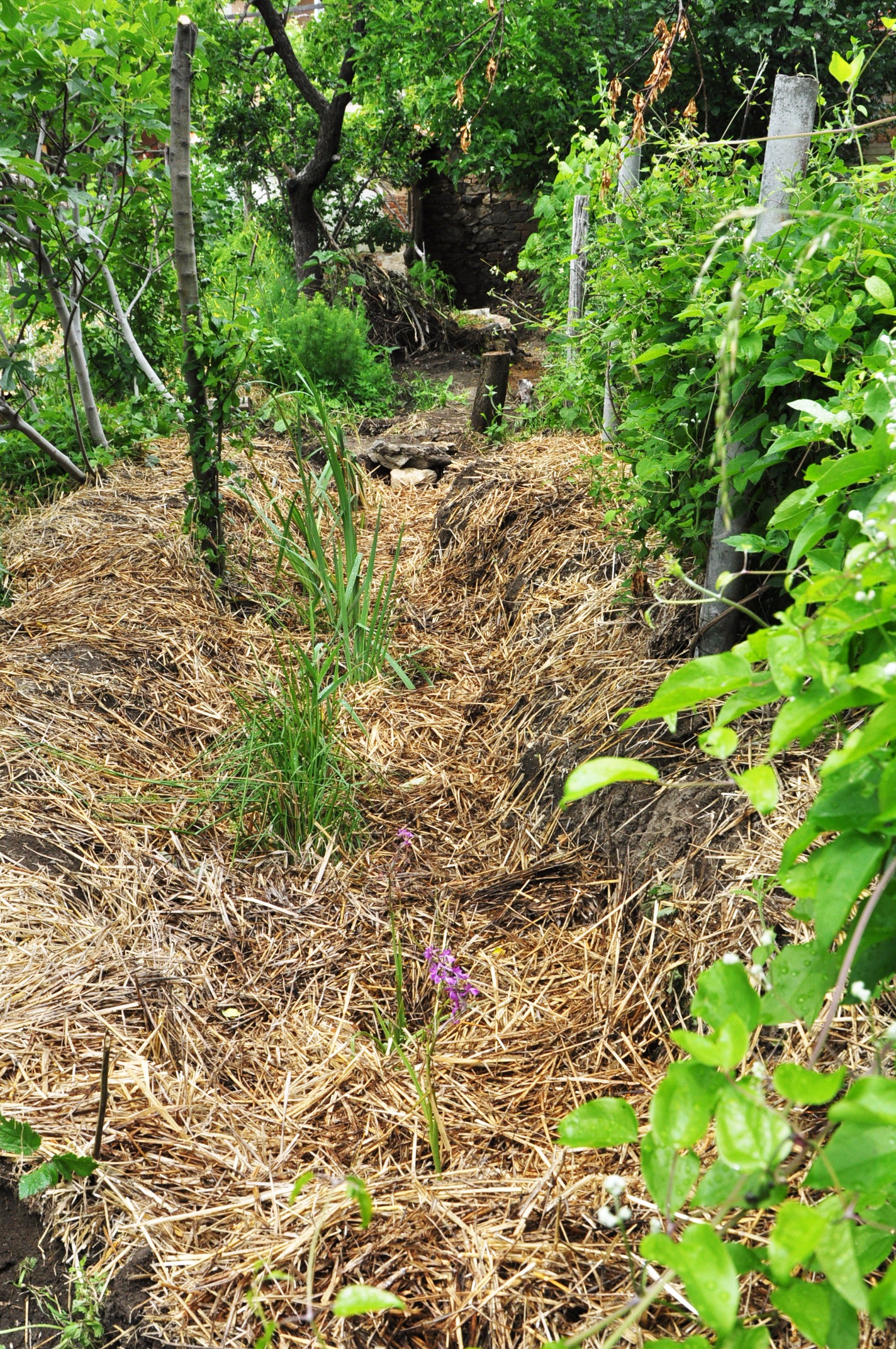 I once truthfully thought greywater was not so important but when you work in drier climates like Bulgaria or Portugal, you realize why the hell isn’t my shower water nourishing the blueberries or citrus. So at Permaship we dug the basin with the students as well as back filled the piping that Paul and me accomplished before the workshop. Greywater is so context dependant and we came up with a hybrid system that was simple. Lots of times, people want to involve plastic liners and complex recirculation this and that’s for filtration but the greatest filter of water is carbon. So we created a mulch basin that was already vegetated on one side with pre-existing fruit trees and then planted it out with wetlands plants. The wetlands plants were not necessary, but that is why it is a hybrid system because the plants that Paul choose to irrigate were wetlands species. His context was he wanted to bring biodiversity to his small plot, where his sons could see the abundance of Nature through diversity of habitat. So we dug up some wetlands plants from the mountainside and placed them accordingly and left a channel so that the municipal mountain water could be brought in on occasion to wash salts through and supplement the irrigation for these young plants. Overall I think it was a great design and met the needs in many ways of this context dependant situation. There is no stamp in Permaculture, no premade form that allows you to just always create a monoculture, its site and climates specific factors which alter ones design.