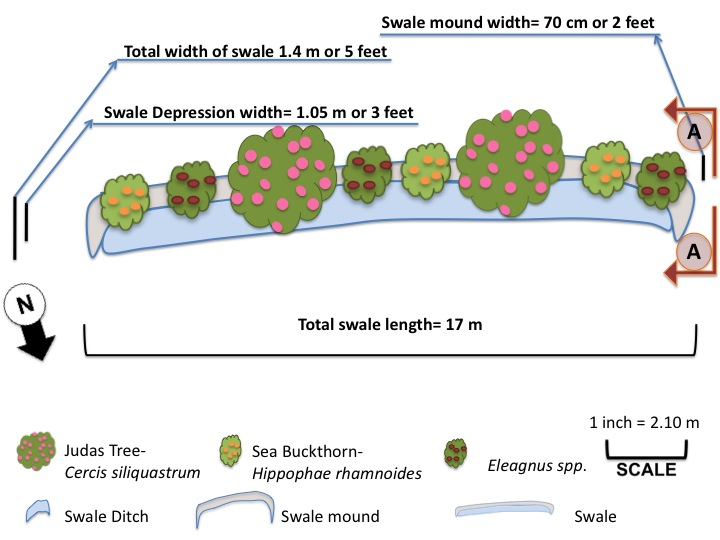 In Shipka, the village residents have the ability to open and close channels of water that are directed down from the mountain. Despite the fact that on average we have only 7% of the year with rainfall, there flows water constantly from the highlands above. Springs enrich this little village because there is a forest, multilayered and complex, full of soil life and a sponge and open channel for water. This leads to infiltration rather than rapid runoff and the constant source of spring water is renewed. This water is then diverted into the municipality irrigation scheme which with a sandbag here and there allows residents to nourish there small scale intensive plots. At Permaship a food forest is beginning which needed the integration of some chop and drop, hardy windbreak yet edible plants which is what we brought in. So we created a swale, running on contour, and then planted out with Eleagnus and Sea Buckthron to name a few. The design is below of the anchor plants while the understory will be furthered developed with perennial vegetables in the wetter parts of the year.