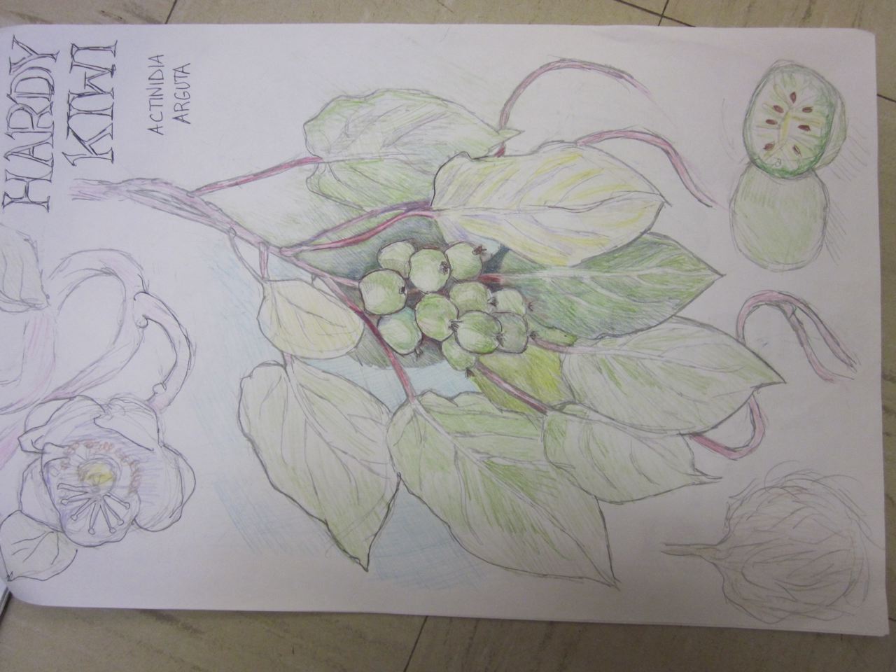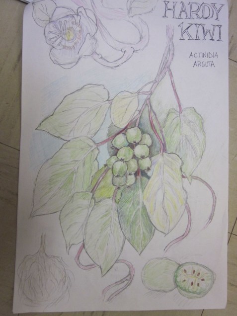 As the course snaked along the group really came together and I really formed some nice bonds. We were having fun monitoring compost after school and putting some beds to rest for the winter from time to time. Since it is a university course the students were of course kept busy with different assignments. One that we did again this time was the plant species research assignment and I thought I would just share this one with you because it is a beautiful representation of the Hardy Kiwi by Kimber O’brien.