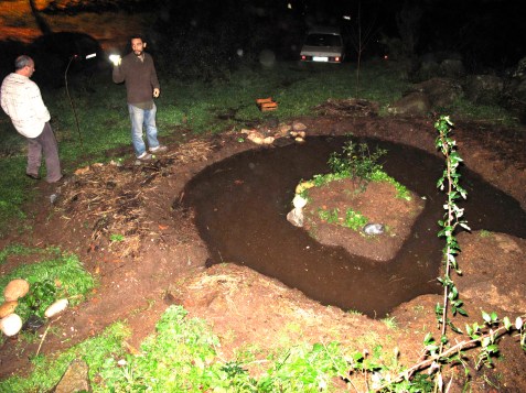 The swale had quite an evolution in may ways. The initial spillway was too not fortified enough and a bit too low. So we did some more digging and mounding on the far side and reinforced the spillway with rubble. This made the water holding capacity greater and reduced the risk of blowout from erosion on the spillway. Over the next two weeks it filled up many times and collected large amounts of silts and sand that would have just eventually washed away. It was amazing to see the core model and dendritic pattern come together with the catchment branching and collecting into one main artery but as it moved to its sink, it created a delta effect. The sand and silts deposits would grow each time the rains would come and the “beach” got bigger and bigger. The delta changed directions and which artery being the main channel to the swale changed and with it different sized sediments being deposited. The swale remained almost full always as when it wasn’t raining the surrounding hillsides were weeping water for hours after the course ended. Thus the road and roof runoff was a mini ecosystem that proved to be quite a teaching tool for patterns and harnessing a valuable energy source.